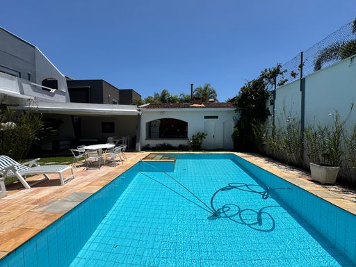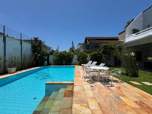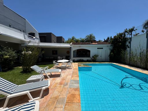 Ao lado da piscina, há mais um espaço coberto para refeições, ampliando ainda mais as opções de lazer. O quintal é amplo, com gramado, jardim, corredores laterais e total aproveitamento do terreno.