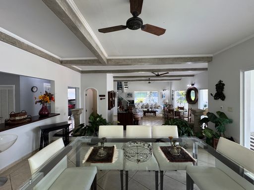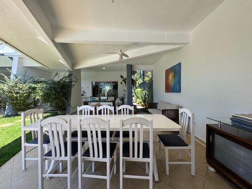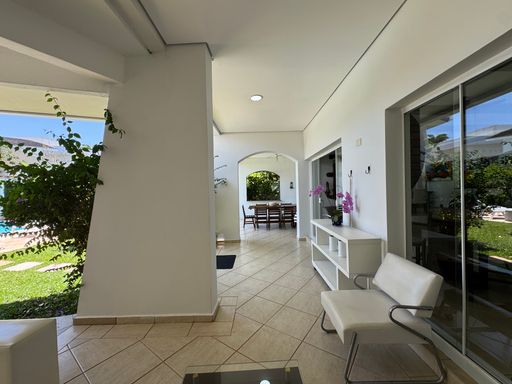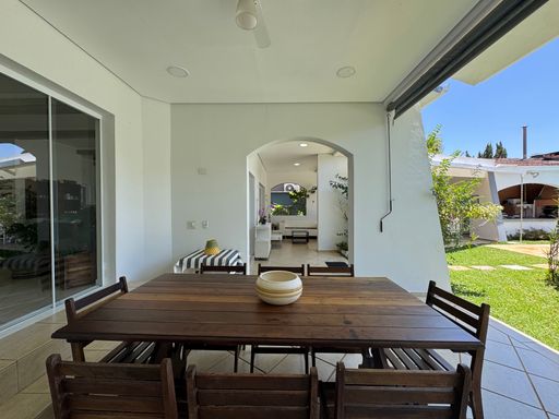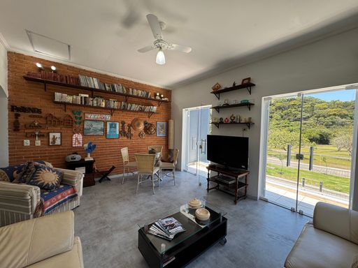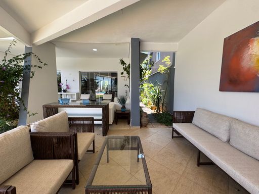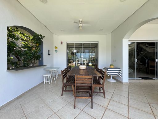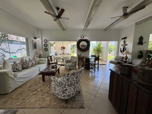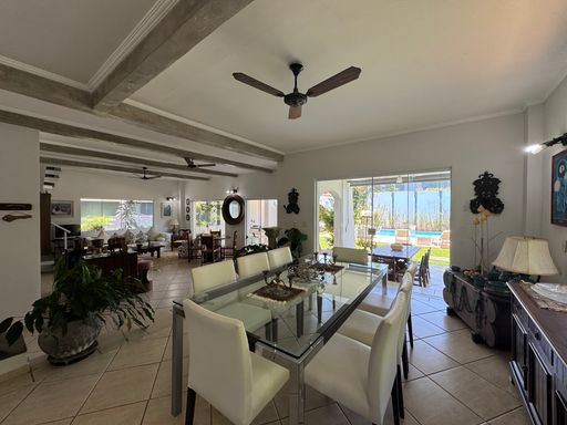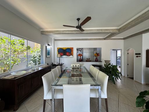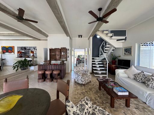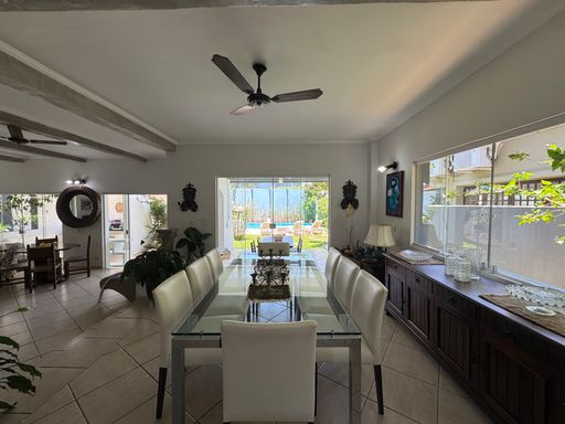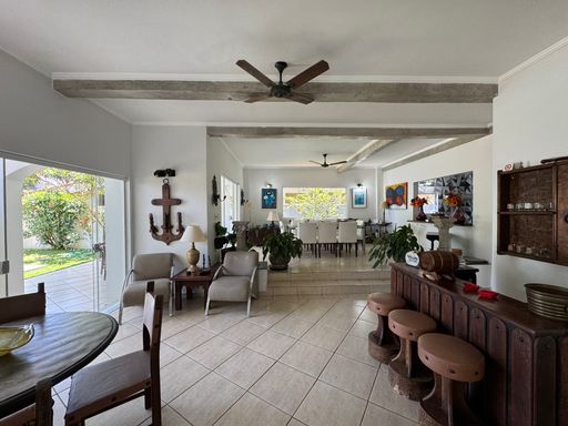 Ao entrar, você encontra uma sala , integrada e bem iluminada, com grandes janelas, ventiladores de teto e áreas de estar distribuídas de forma confortável. O ambiente conta com sofás brancos, bar em madeira e espaço para vários tipos de decoração. A sala de jantar fica estrategicamente posicionada, trazendo amplitude e ligação direta com a varanda e o jardim.