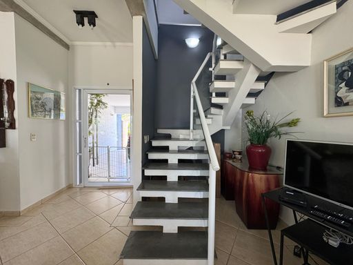 A escada em ardósia com corrimão branco leva ao piso superior, onde há uma segunda sala íntima com varanda e vista aberta para a rua. Esse espaço é ideal para leitura, TV ou convivência da família.