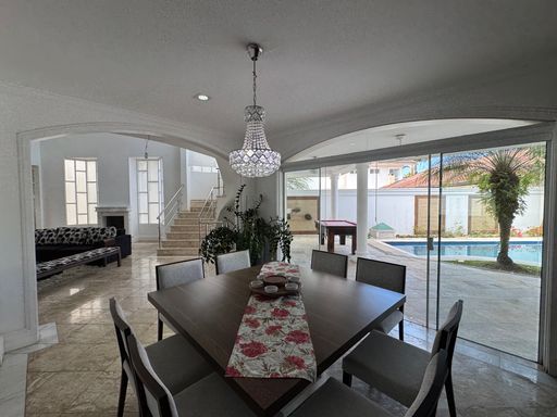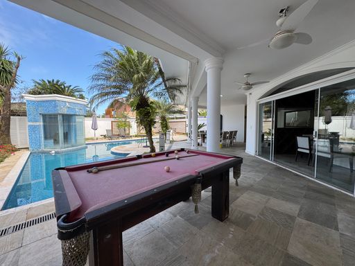 A área externa do imóvel é um verdadeiro convite para momentos de descanso e diversão. A piscina em formato orgânico, que lembra um “8”, traz aquele charme clássico e proporciona um visual acolhedor. Integrada à piscina, a sauna garante conforto e a sensação de estar em um resort dentro de casa. Ao lado, há um espaço amplo e climatizado com uma mesa de bilhar, ideal para reunir amigos, jogar conversa fora e aproveitar ao máximo os dias de lazer. O conjunto entre piscina, sauna, jardim e sala de bilhar cria um ambiente completo para quem valoriza conforto, privacidade e boa convivência.