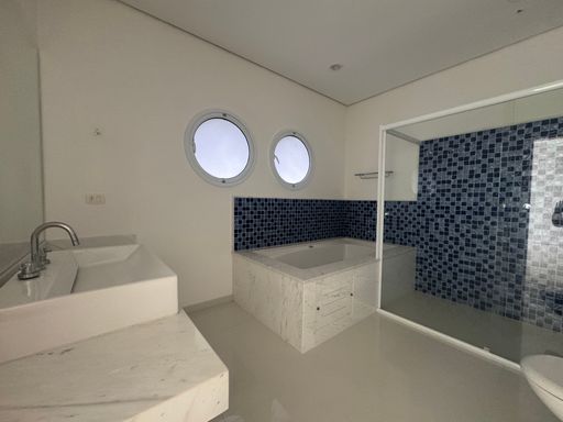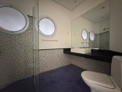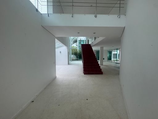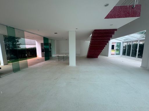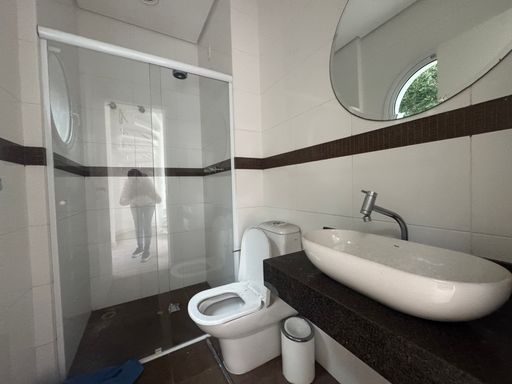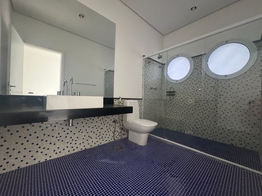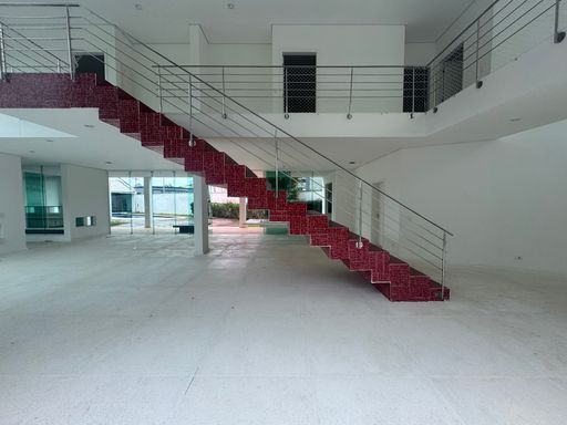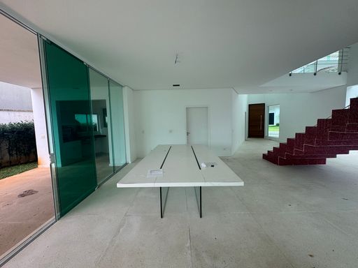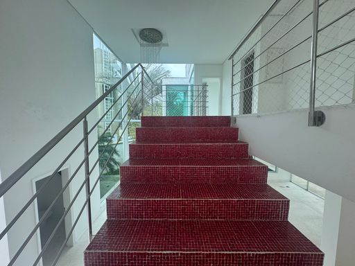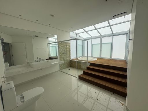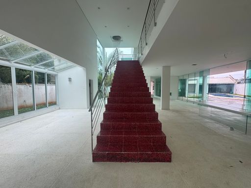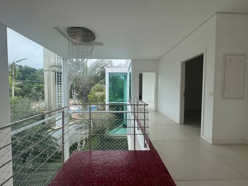 Subindo, temos uma escada marcante revestida em pastilhas vermelhas, que já chama atenção por si só. E acompanhando essa escada, um lustre de cristal deslumbrante, descendo por dois andares e iluminando o hall com imponência. No piso superior, um corredor espaçoso leva às suítes, todas com excelente ventilação, varandas envidraçadas e muito espaço para conforto e privacidade da família.Na área íntima, todas as suítes são amplas, mas a suíte master é um espetáculo à parte: são dois closets independentes e dois banheiros privativos, sendo um deles com banheira de hidromassagem em um ambiente envidraçado e iluminado naturalmente, criando um verdadeiro refúgio de descanso.