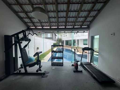 - Academia equipada, com vista para a piscina e ambiente envidraçado.
