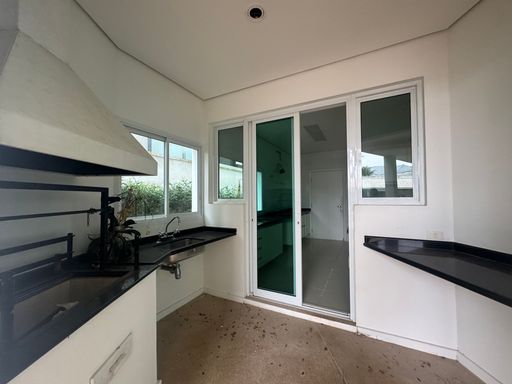 A cozinha é generosa, planejada com ilha central, bancadas em granito preto e bastante espaço para organização. E ainda temos uma churrasqueira interna, perfeita para dias de lazer dentro de casa.