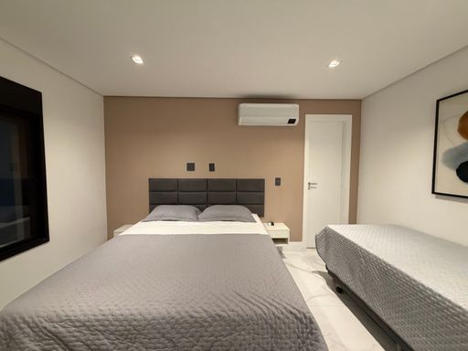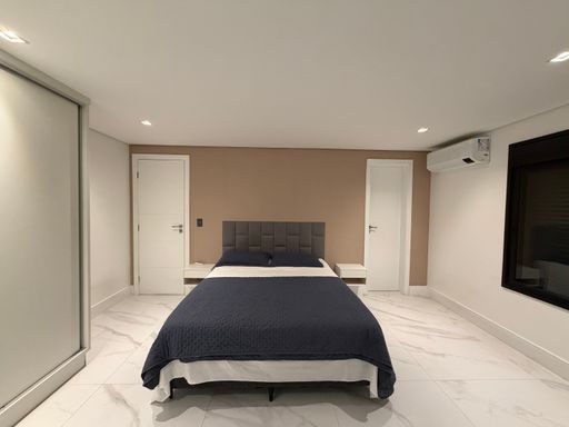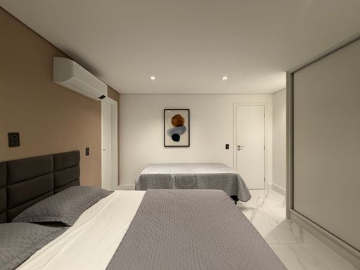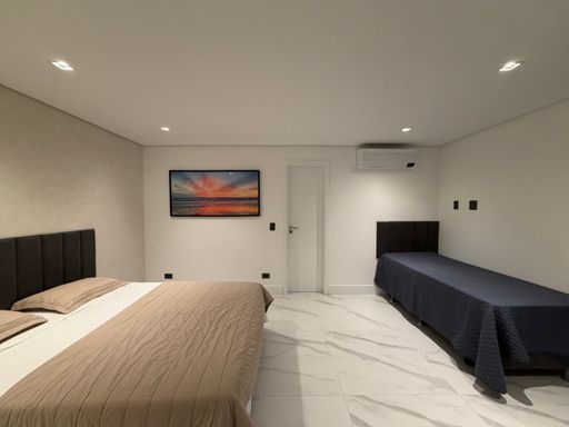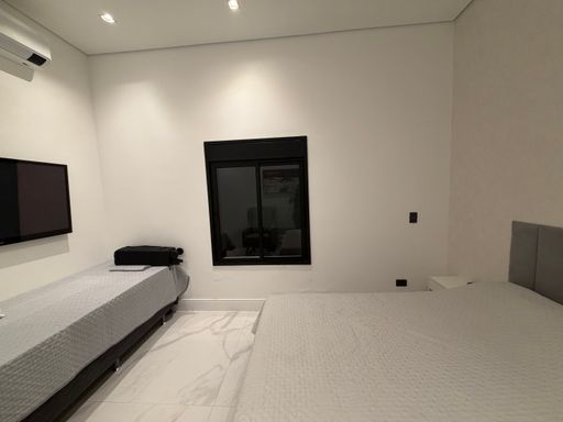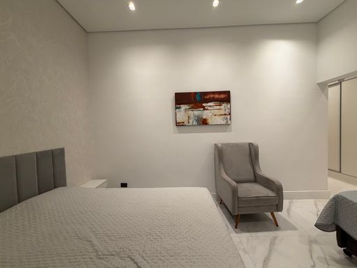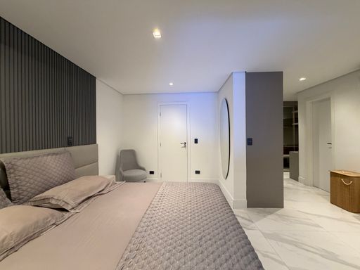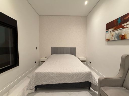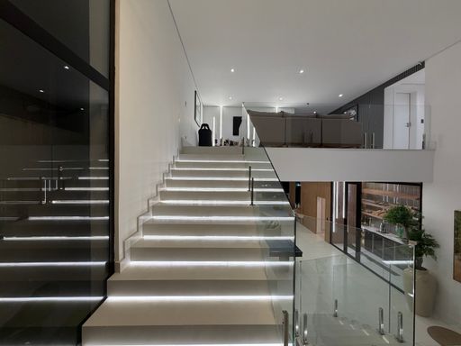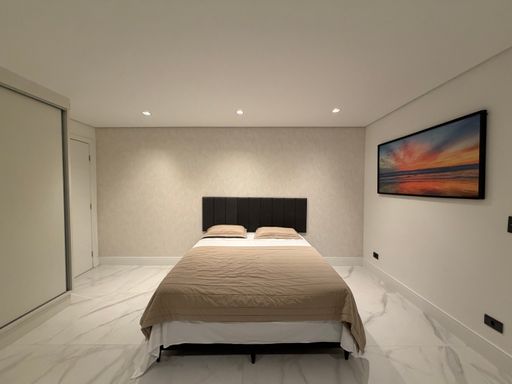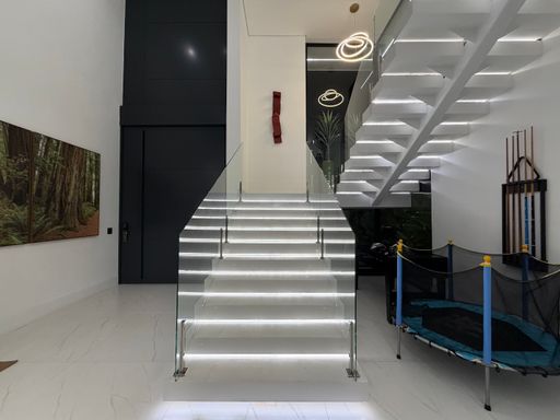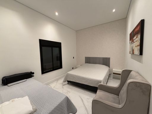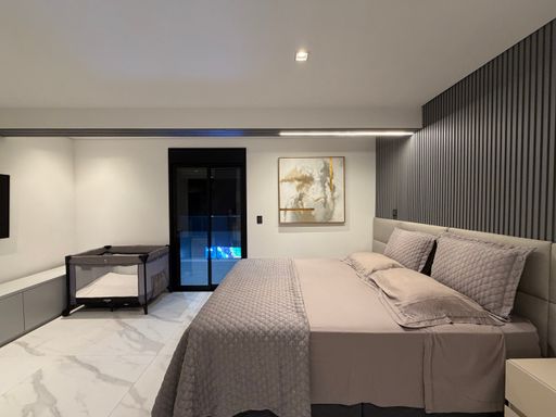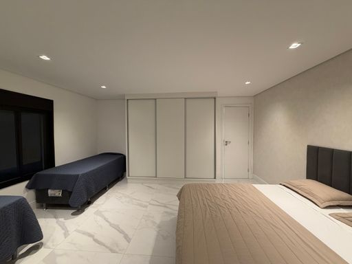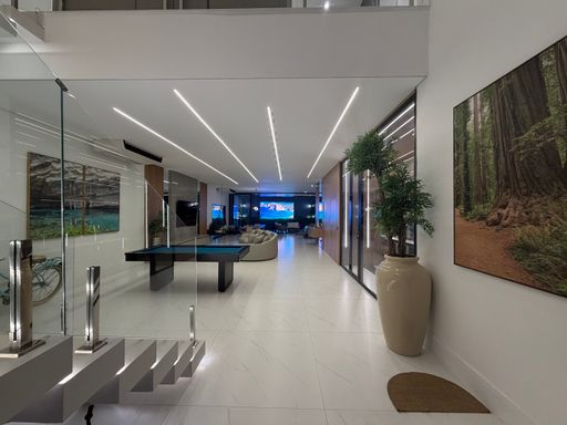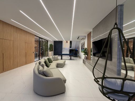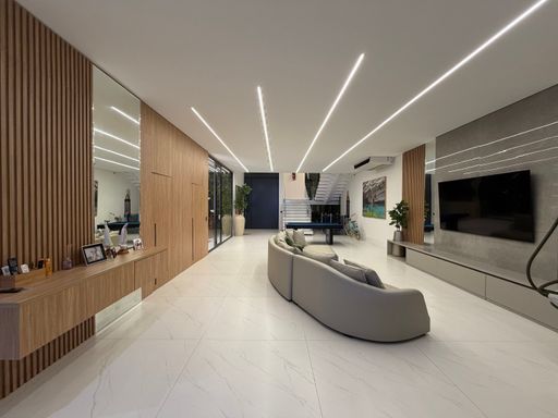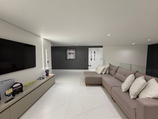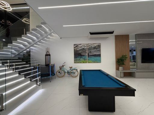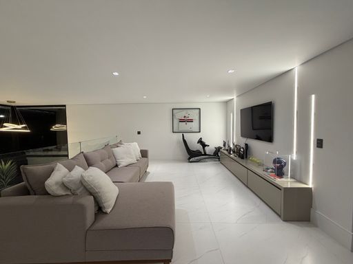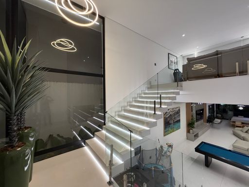 A escada moderna com iluminação em LED conduz ao pavimento superior, onde logo ao subir encontramos uma agradável sala íntima de jogos com TV, perfeita para momentos de lazer. No mesmo pavimento ficam as suítes amplas da casa, incluindo uma elegante suíte master.
