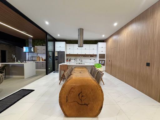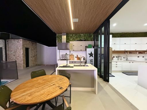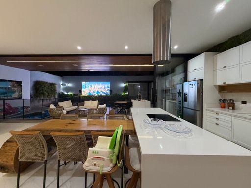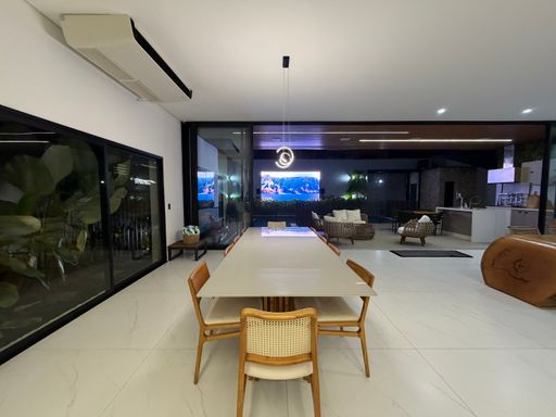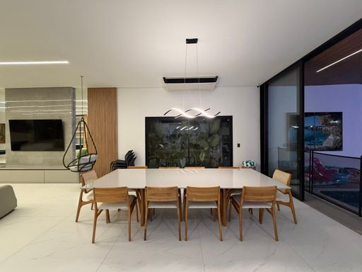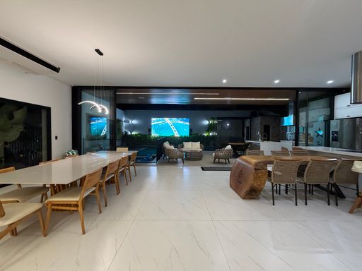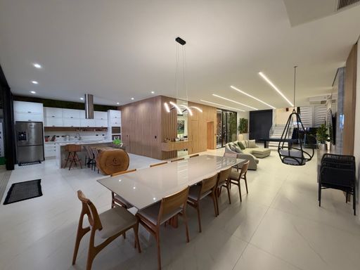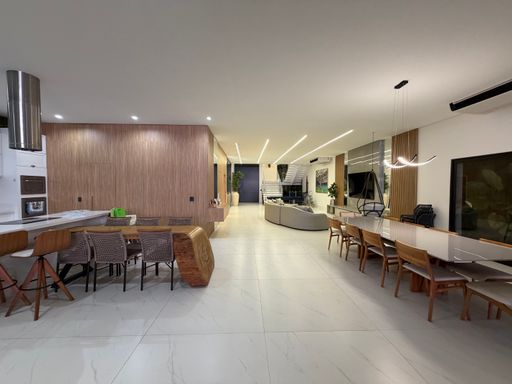 Avançando pela casa, os ambientes se abrem para uma ampla área integrada que conecta sala de jantar, cozinha e espaço gourmet, criando um espaço perfeito para receber amigos e familiares.