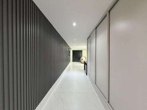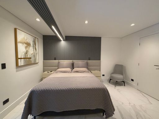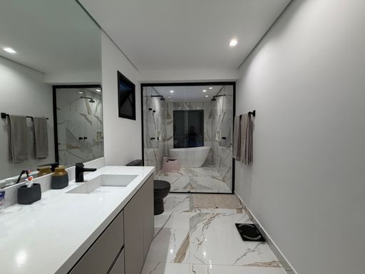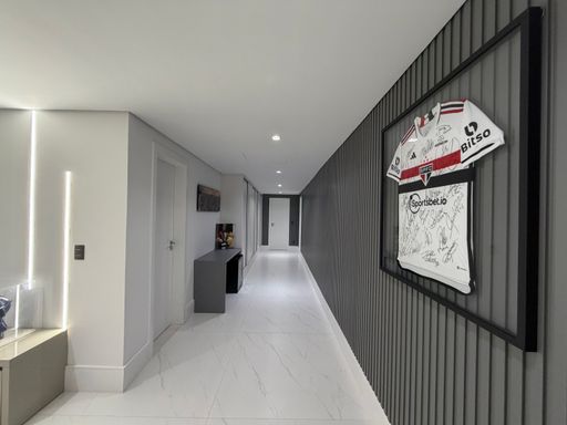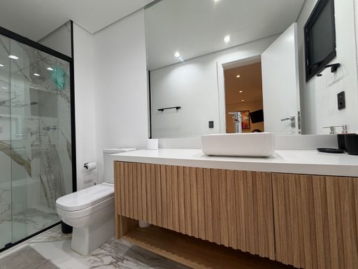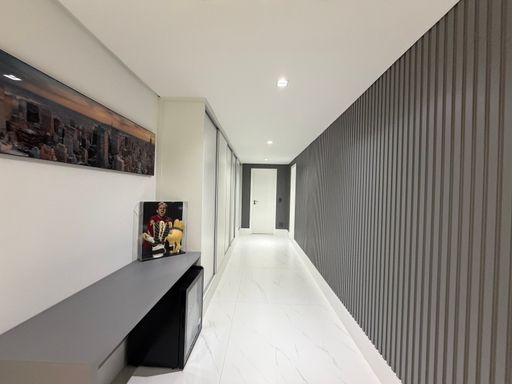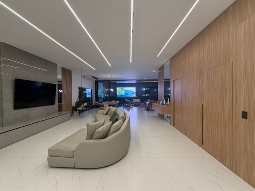 Logo na entrada, o visitante é recebido por um ambiente amplo e sofisticado, com pé-direito alto, iluminação em LED e uma decoração contemporânea que valoriza os espaços.