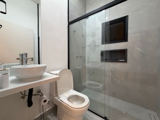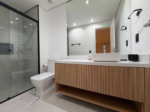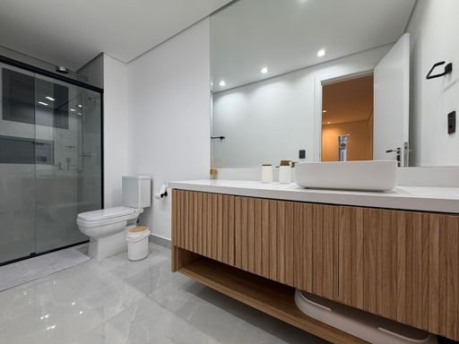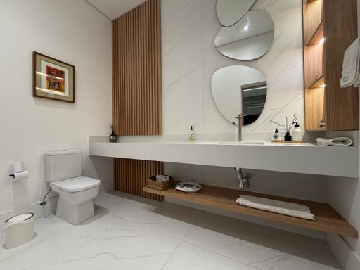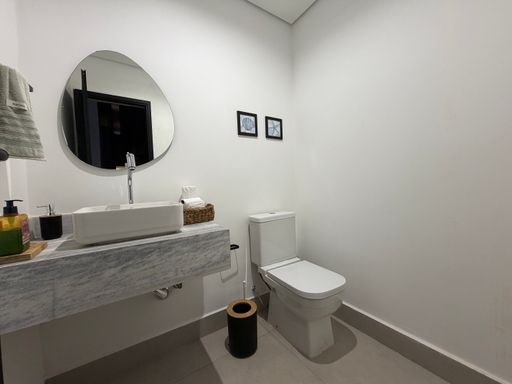 Ainda na área social do pavimento térreo, a casa conta com um lavabo elegante para atender visitas, além de uma suíte térrea, perfeita para hóspedes ou para quem busca mais praticidade.