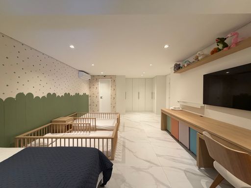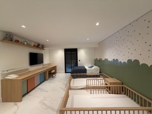 Seguindo pelo living, encontramos uma confortável sala de TV, planejada para momentos de descanso e entretenimento.