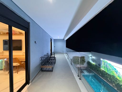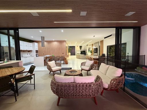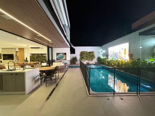 Toda essa área possui grandes aberturas em vidro, permitindo total integração com o espaço externo.