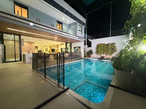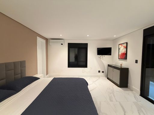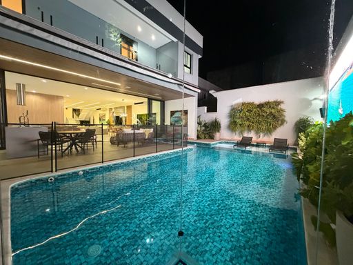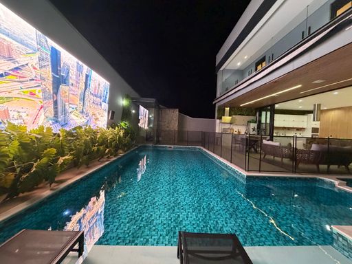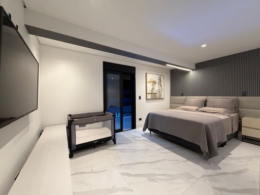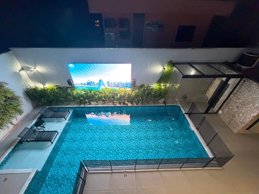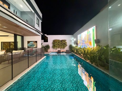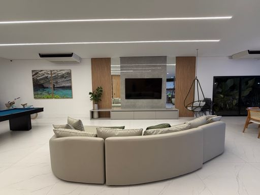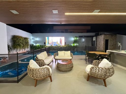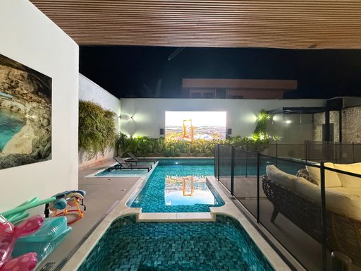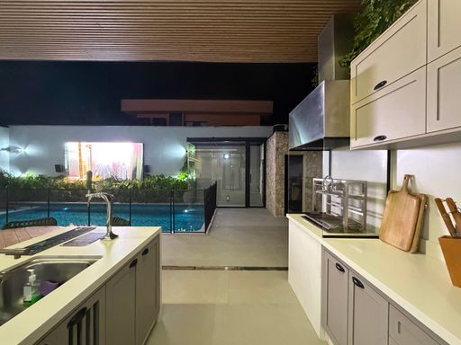 Outro grande diferencial é o telão externo voltado para a piscina, perfeito para assistir filmes, eventos ou jogos enquanto aproveita momentos únicos com família e amigos.