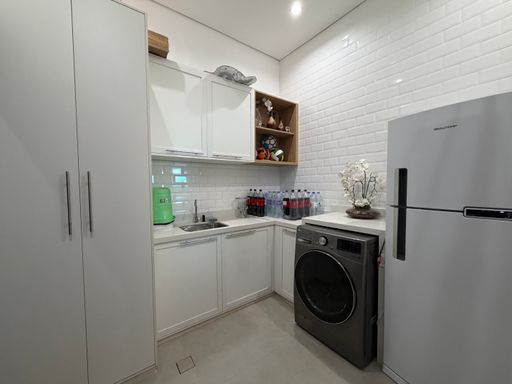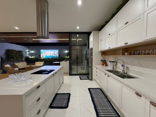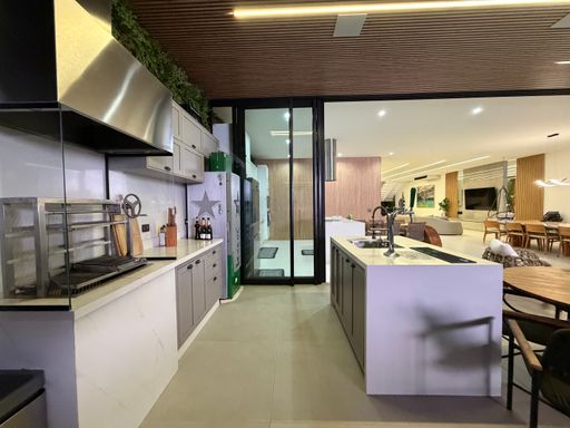 A cozinha se integra diretamente ao espaço gourmet completo, equipado com churrasqueira a carvão, bancada de apoio, chopeira e estrutura perfeita para confraternizações.