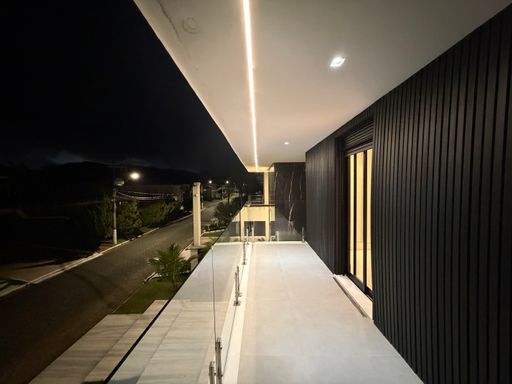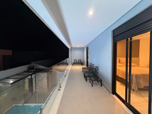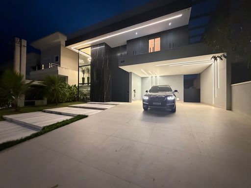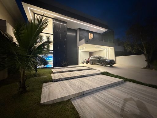Logo ao chegar, a residência já impressiona pela fachada moderna e imponente, com linhas arquitetônicas contemporâneas e iluminação cênica que valoriza cada detalhe do projeto.