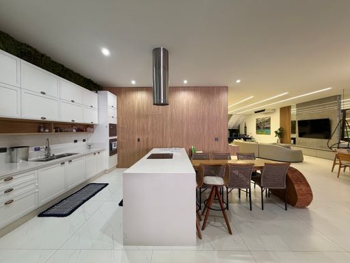 Ao lado, a cozinha planejada impressiona pelo design moderno e funcionalidade. O espaço conta com armários planejados, eletrodomésticos embutidos e uma grande ilha central.