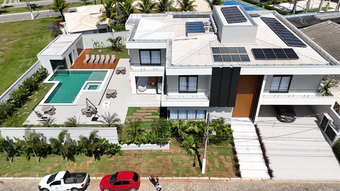 Logo na chegada, você já entende que essa casa é única. A fachada é imponente, com linhas modernas, detalhes em painel preto, paisagismo tropical e uma porta monumental em ripado com quase 10 metros de altura, equipada com fechadura digital. À noite, a iluminação em LED transforma a fachada em um verdadeiro cartão-postal. A garagem comporta até 6 carros, garantindo espaço e comodidade.