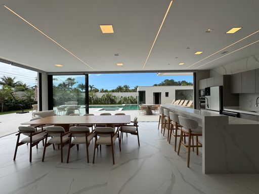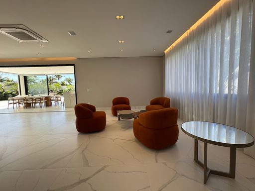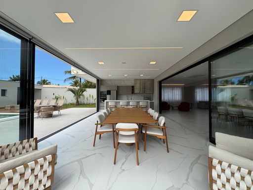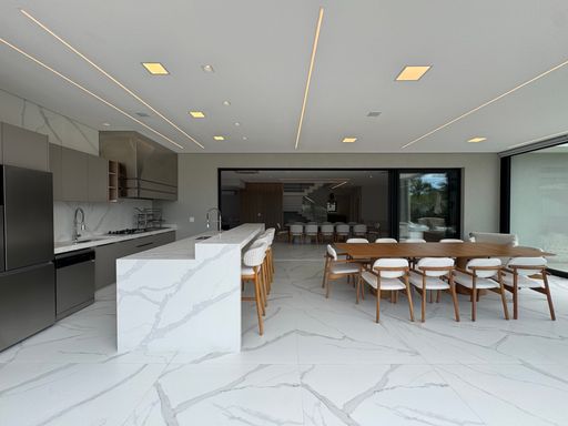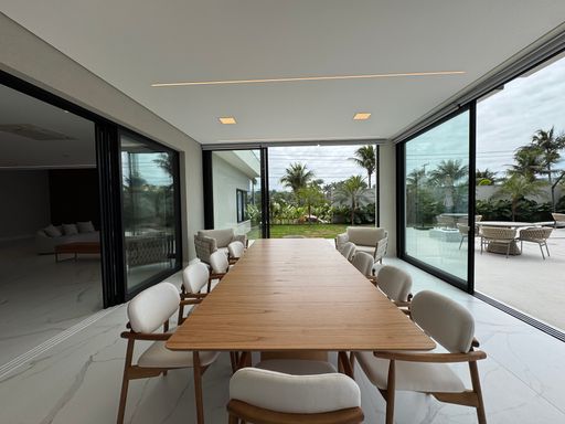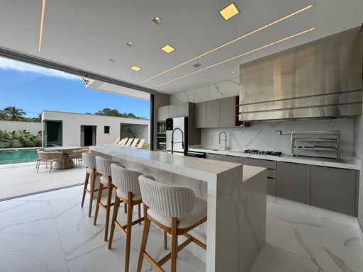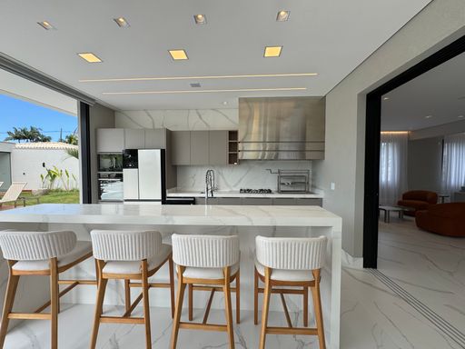 Espaço gourmet: localizado do outro lado, totalmente integrado à área externa, com churrasqueira moderna, bancada em mármore, balcão com 4 banquetas e mesa para 10 lugares. As portas de vidro se abrem por inteiro, conectando o gourmet à piscina e ao jardim perfeito para reuniar amigos e familia.