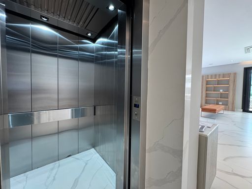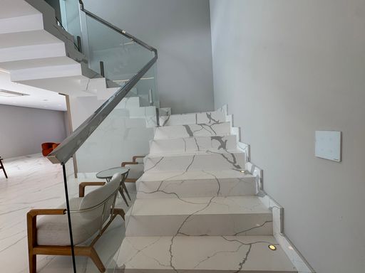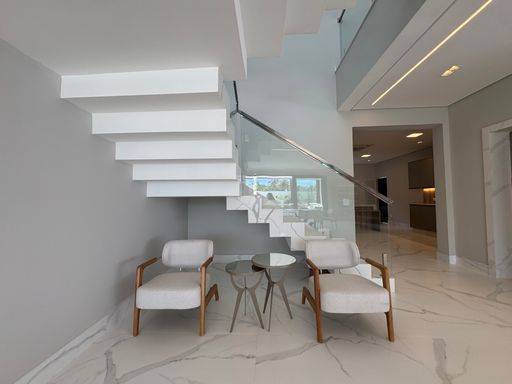 Subindo pela escada branca em design flutuante, com corrimão de vidro e inox, ou pelo elevador, chegamos ao pavimento superior.