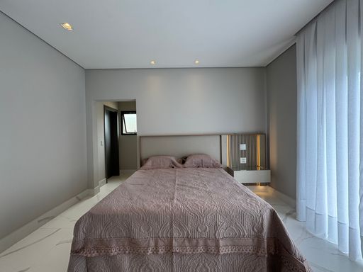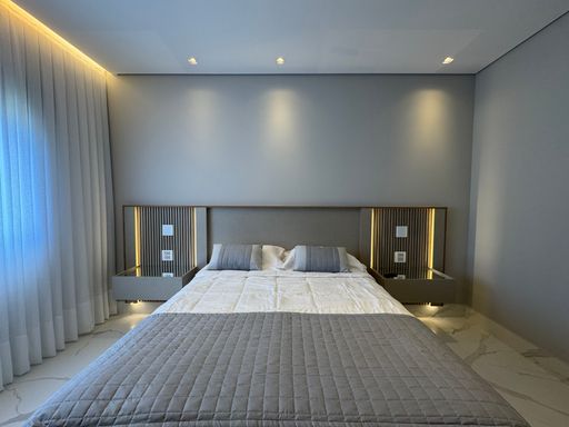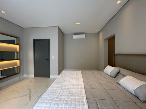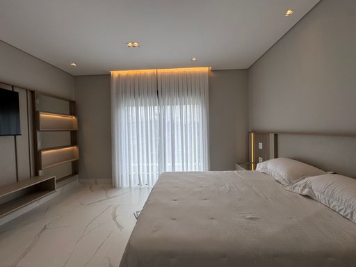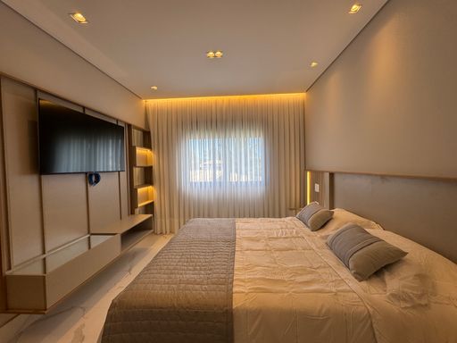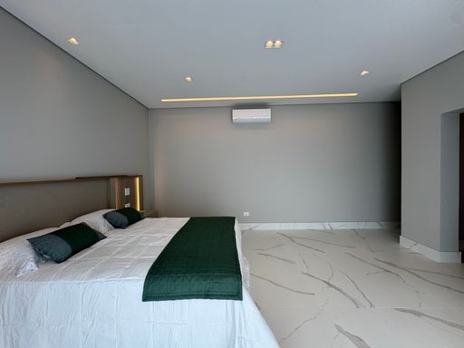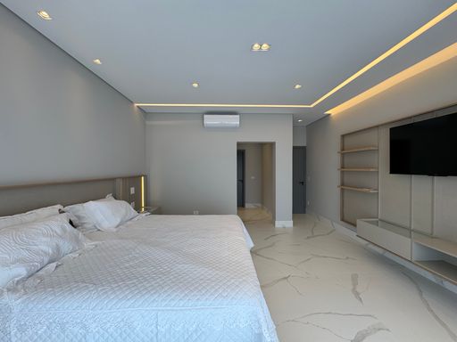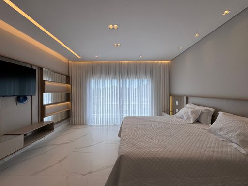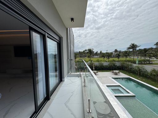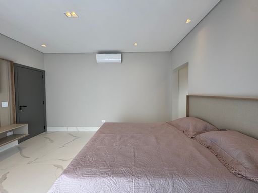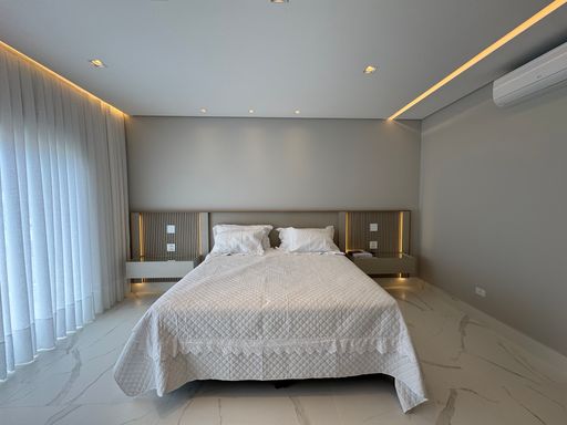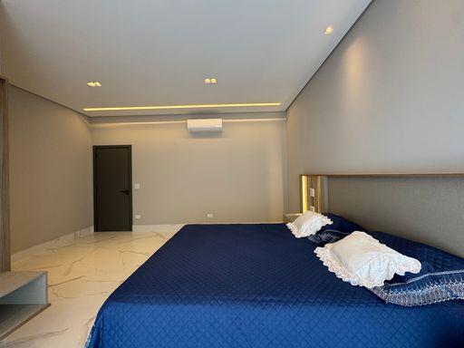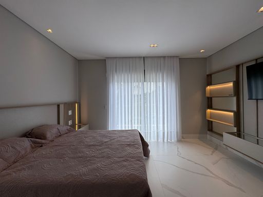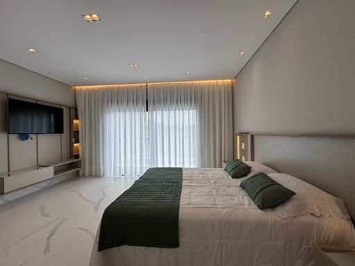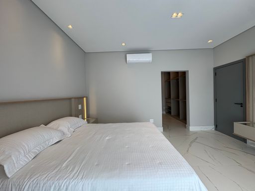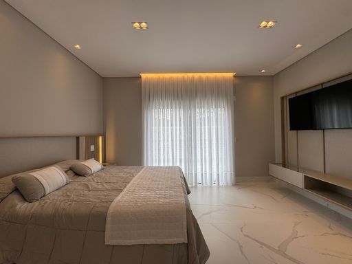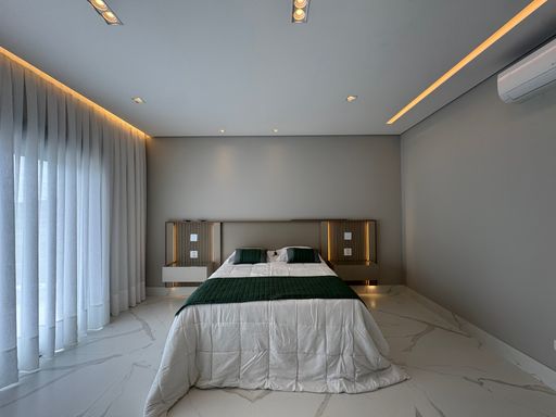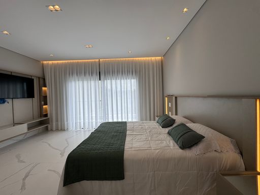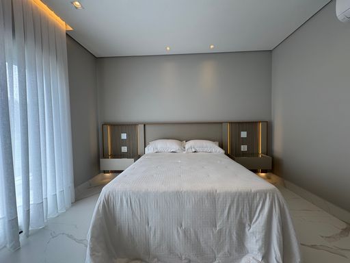 A suíte master é um espetáculo: closet espaçoso e iluminado, banheiro com banheira de hidromassagem, pia dupla em pedra exótica, iluminação embutida e sacada privativa com vista para a piscina;
