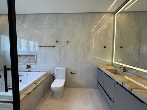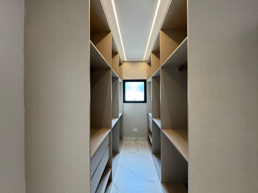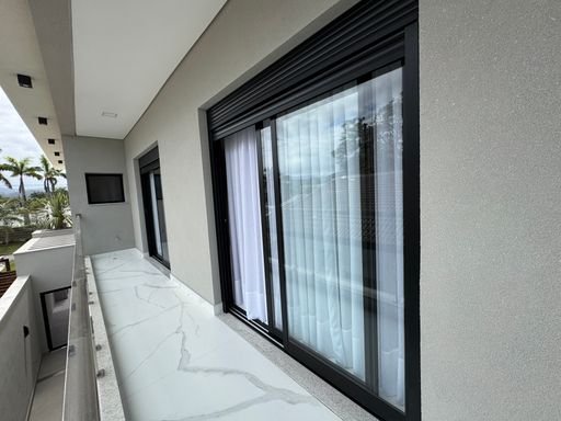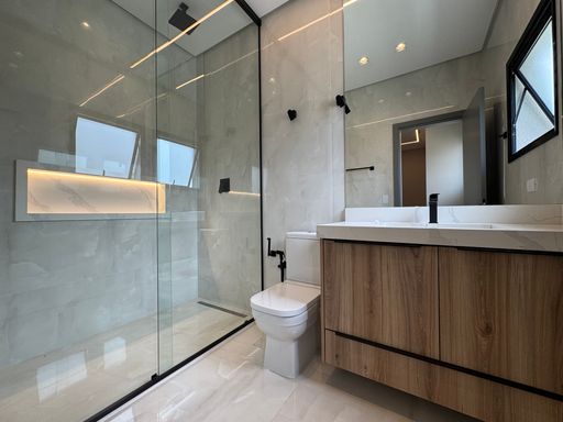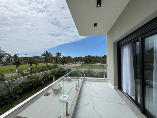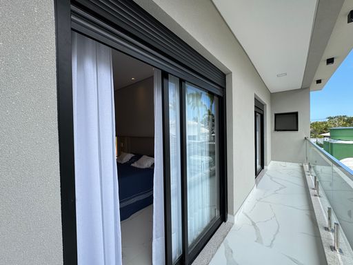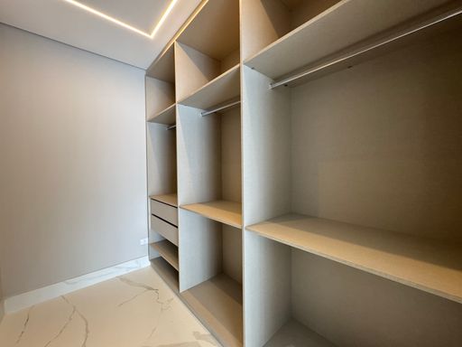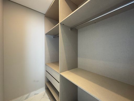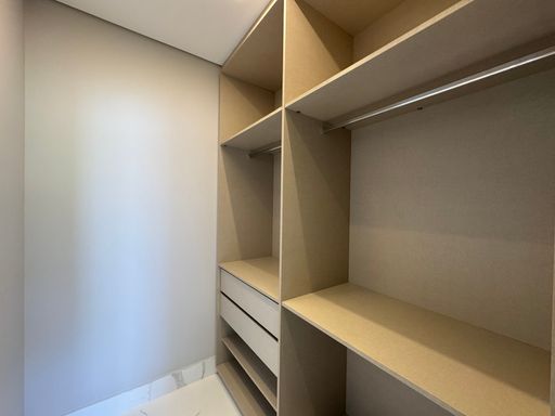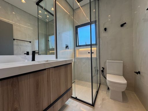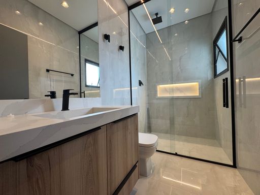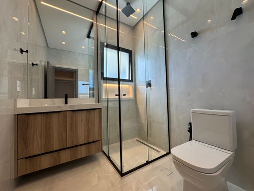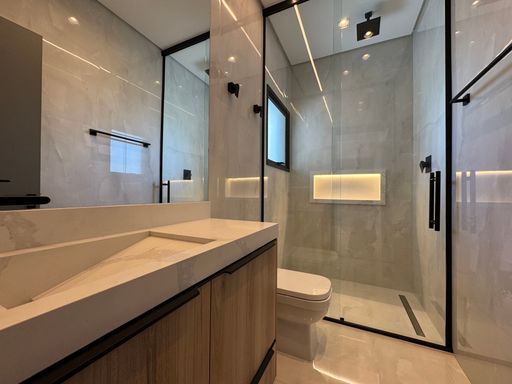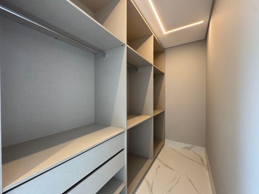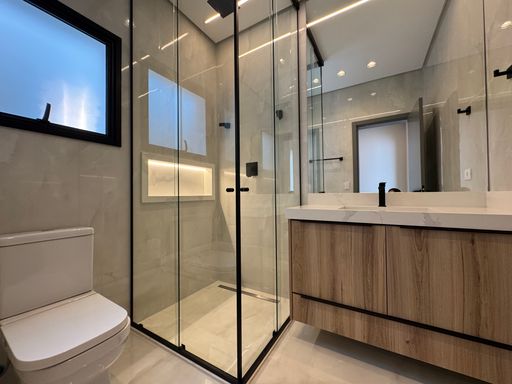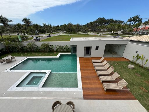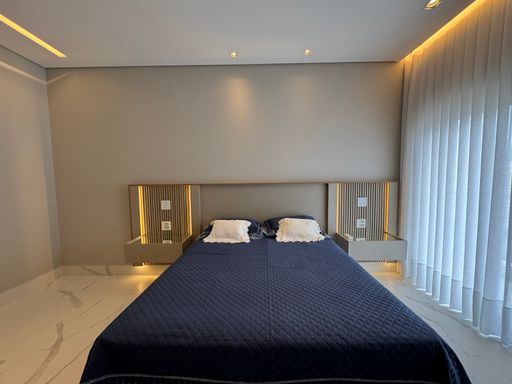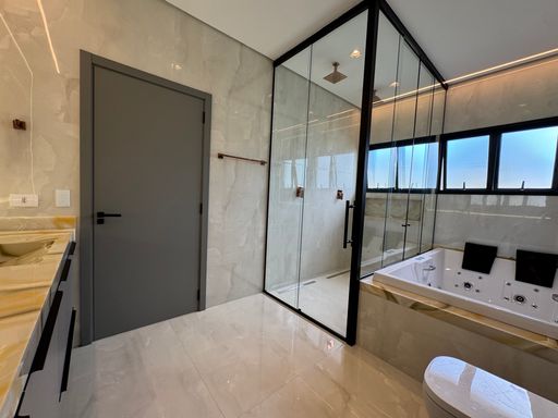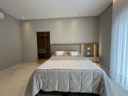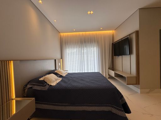 A suíte master é um espetáculo: closet espaçoso e iluminado, banheiro com banheira de hidromassagem, pia dupla em pedra exótica, iluminação embutida e sacada privativa com vista para a piscina;