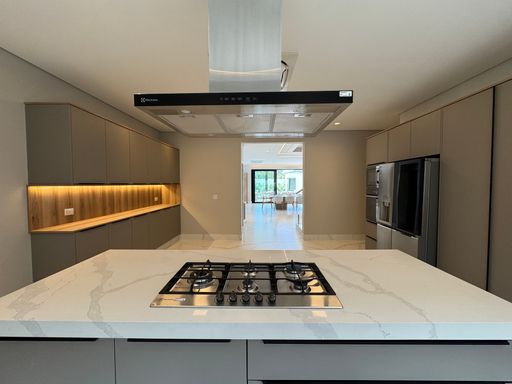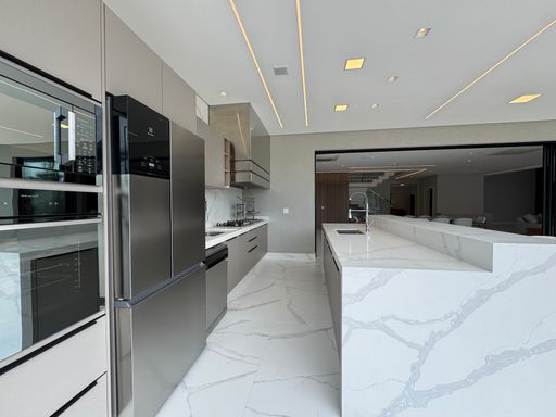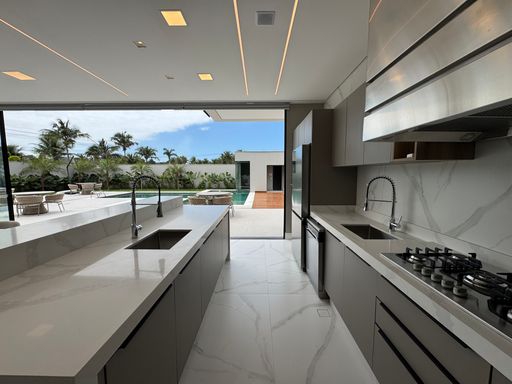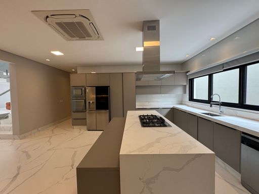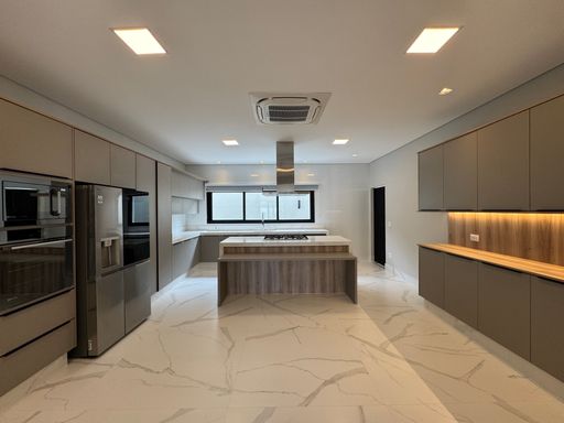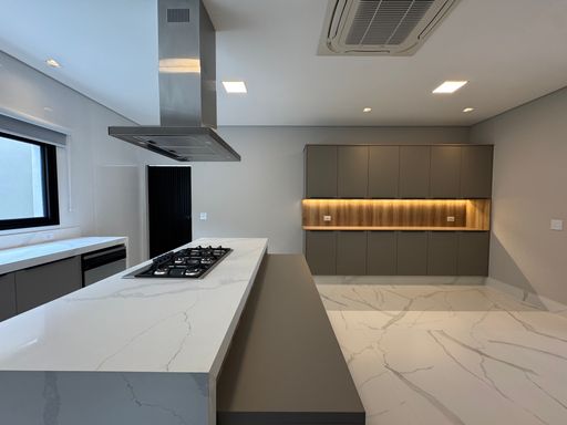 Cozinha principal: planejada, com marcenaria sob medida, ilha central com cooktop, coifa embutida no teto, eletrodomésticos modernos, iluminação elegante e bastante espaço para o uso diário da família.