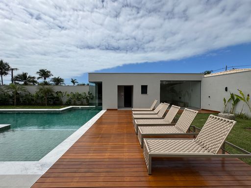 Deck em madeira com 6 espreguiçadeiras e mesas de apoio;