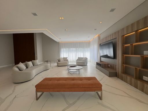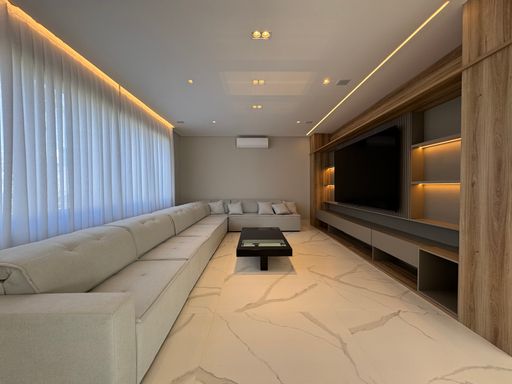 São 4 ambientes integrados: estar, jantar, lounge e TV;
