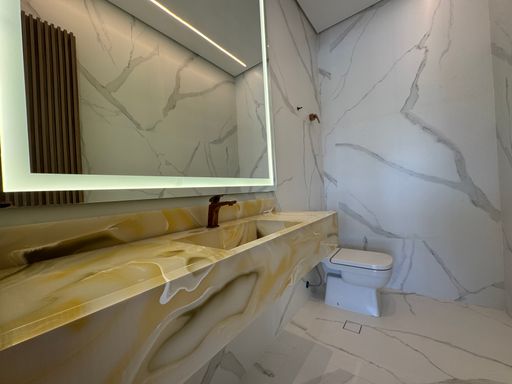 Um lavabo imponente com bancada em pedra exótica dourada e iluminação de design;