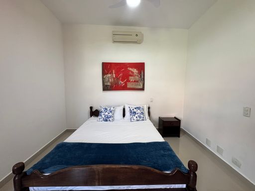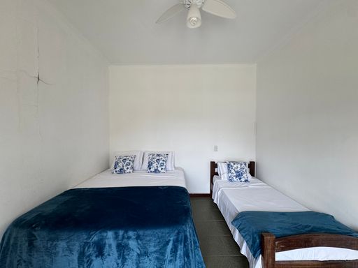 Os ambientes são amplos, com sala de TV, sala de jantar e uma cozinha completa, com geladeira, fogão, micro-ondas e utensílios básicos pra facilitar a estadia.